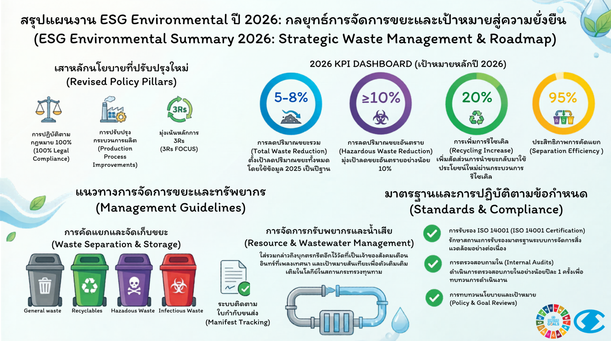 องค์กรได้ประกาศแผนงานด้านสิ่งแวดล้อม (Environmental) ภายใต้กรอบ ESG ประจำปี 2026 โดยมุ่งเน้นการจัดการขยะอย่างเป็นระบบและยั่งยืน ผ่านการกำหนดนโยบายและเป้าหมายเชิงกลยุทธ์ที่ชัดเจน เพื่อยกระดับประสิทธิภาพการดำเนินงานและลดผลกระทบต่อสิ่งแวดล้อมในระยะยาว