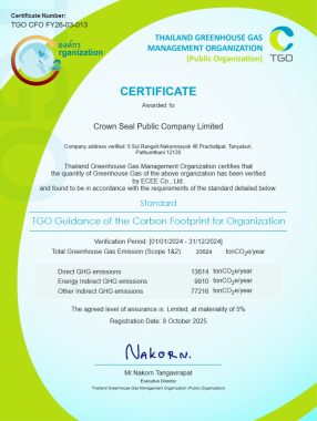 ข่าวสารและกิจกรรม บริษัท ฝาจีบ จำกัด (มหาชน) ได้รับการขึ้นทะเบียนเครื่องหมายคาร์บอนฟุตพริ้นท์ขององค์กร (Carbon Footprint for Organization : CFO) เมื่อวันที่ 8 ตุลาคม 2568 บริษัทฯ ได้สนับสนุนกิจกรรมลดก๊าซเรือนกระจก และให้ความสำคัญในด้านการจัดการก๊าซเรือนกระจกตลอดห่วงโซ่คุณค่า ตั้งแต่การจัดหาแหล่งวัตถุดิบ การพัฒนาประสิทธิภาพของกระบวนการผลิตและการใช้พลังงาน จนถึงการส่งมอบสินค้าไปยังบริษัทลูกค้า และเนื่องจากการปล่อยก๊าซเรือนกระจกจากภาคอุตสาหกรรมเป็นประเด็นหนึ่งที่ส่งผลโดยตรงต่อการเปลี่ยนแปลงสภาพภูมิอากาศของโลก ที่ก่อให้เกิดภัยพิบัติทางธรรมชาติและความเสี่ยงต่อการเปลี่ยนแปลงสภาพแวดล้อม ตลอดจนการใช้ชีวิตของผู้คน บริษัทฯ จึงได้ตระหนักถึงความรับผิดชอบในฐานะเป็นหนึ่งในผู้ปล่อยก๊าซเรือนกระจกของภาคอุตสาหกรรม โดยการจัดทำ “คาร์บอนฟุตพริ้นท์องค์กร” (Carbon Footprint for Organization : CFO) เพื่อแสดงปริมาณก๊าซเรือนกระจกที่ปล่อยออกมาจากการดำเนินกิจกรรมขององค์กร ซึ่งจะทำให้บริษัทสามารถจัดลำดับแหล่งการปล่อยก๊าซที่สำคัญและหาแนวทางเพิ่มประสิทธิภาพการใช้พลังงาน พร้อมทั้งสร้างจิตสำนึกให้กับพนักงานในการใช้ทรัพยากรธรรมชาติ เพื่อลดปริมาณการปล่อยก๊าซเรือนกระจกอย่างยั่งยืนต่อไป โดยบริษัทฯได้ผ่านการตรวจรับรองและขึ้นทะเบียน “คาร์บอนฟุตพริ้นท์ขององค์กร” (Carbon Footprint for Organization : CFO) ตามมาตรฐานและข้อกำหนด ขององค์การบริหารจัดการก๊าซเรือนกระจก (องค์การมหาชน) และได้รับ Certificate Standard TGO Guidance of the Carbon Footprint for Organization เป็นที่เรียบร้อย